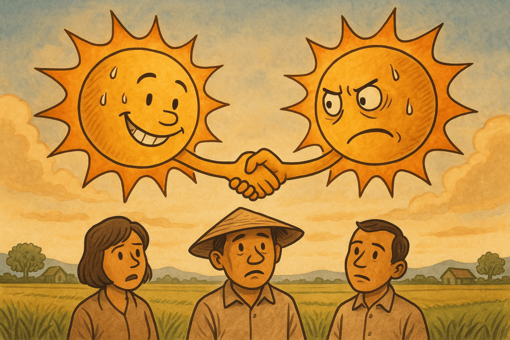 Di pasar, para pedagang tak tahu harus menyusun barang dagangan menghadap cahaya yang mana. Di ladang, tanaman pun kering bukan karena kemarau, tapi karena sinar ganda yang tak kenal kompromi. Bahkan kalender pun rusak – hari-hari politik tiba sebelum musim tanam usai.